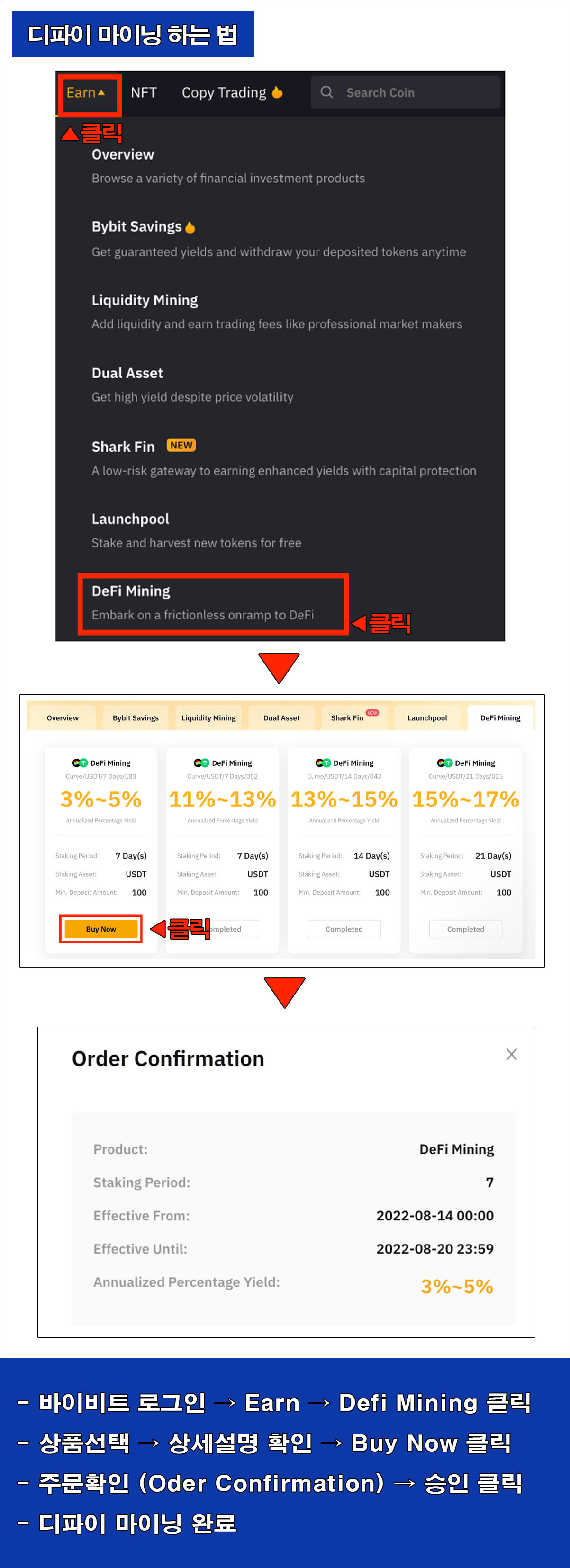 디파이 마이닝은 스테이킹 금융상품과 비슷한 형태로 자산 예치를 통한 수익 창출 상품이다. 바이비트 디파이 마이닝을 하려면 KYC 신원인증 1단계 인증은 필수이다.