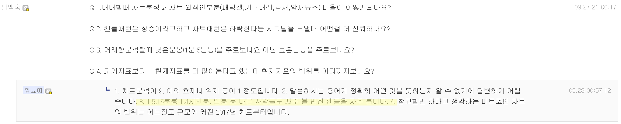 투자할 때 차트분석을 90%, 그리고 악재 등의 뉴스는 10% 정도만 참고한다고 한다. 차트는 1, 5, 15분봉과 1, 4시간, 일봉 등 다른 사람들도 자주 볼법한 캔들은 본다고 한다.