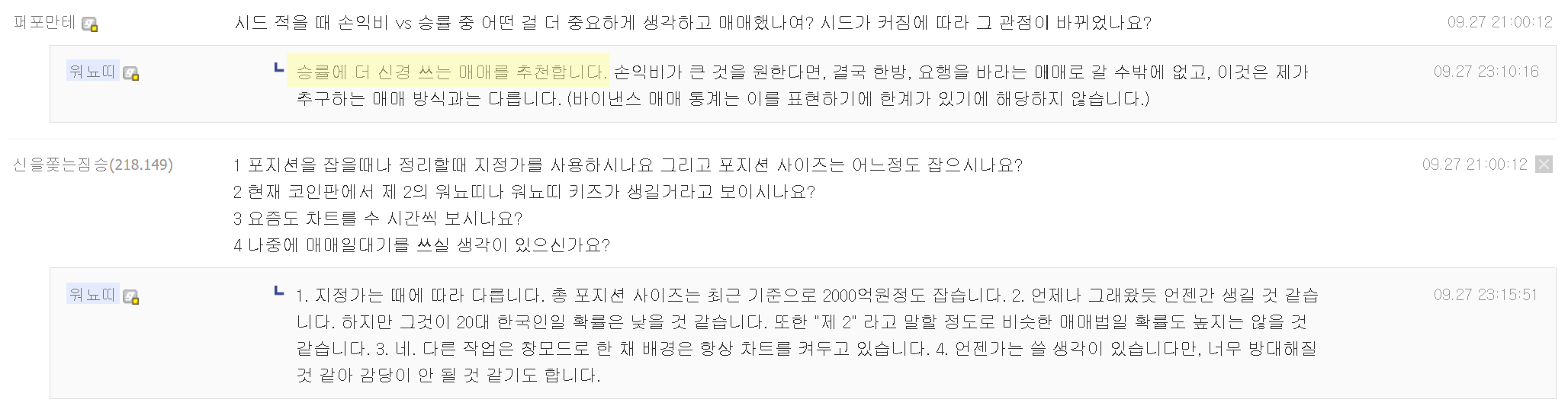 3년동안 3000억원의 자산을 증식한 워뇨띠는 공매도로 시장 상황과 관계없이 투자를 할 수 있고 레버리지로 수익을 극대화 했기 때문이다. 워뇨띠는 차트,패턴을 어느정도 참고했을까? 아래 워뇨띠 Q&A를 통해 투자 마인드를 배워보는 것을 추천한다.