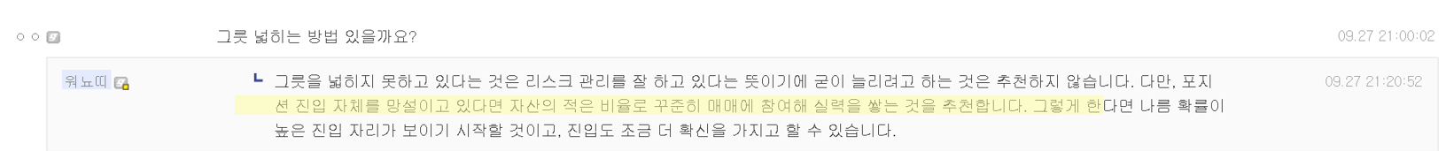 포지션 진입 자체를 망설이는 상태라면 자산의 적은 비율로 꾸준이 매매에 참여하여 실력을 쌓는 것을 추천한다고 한다.