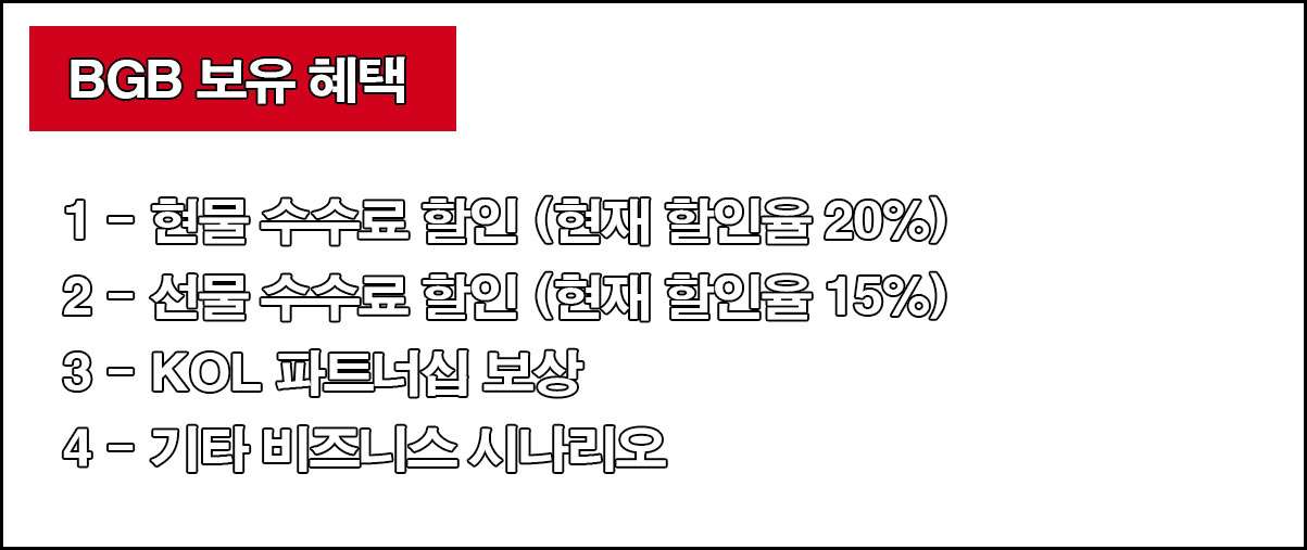 - BGB 사용하여 현물거래 시 20% 수수료 할인, 선물거래 시 15% 수수료 할인