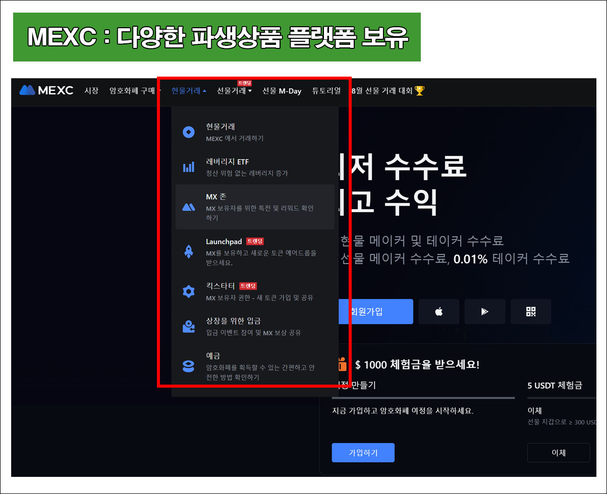 다양한 파생상품 플랫폼이 바이낸스 급으로 서비스를 운영하고 있으며 상장된 코인수는 바이낸스 보다 약 2.5배 이상 많다. 일반적으로 대부분의 마진거래소들이 선물거래와 현물거래 정도를 지원한다면 MEXC는 현물과 마진, 선물, ETF마진, ETF 인덱스 총 5가지의 거래 서비스를 지원한다.