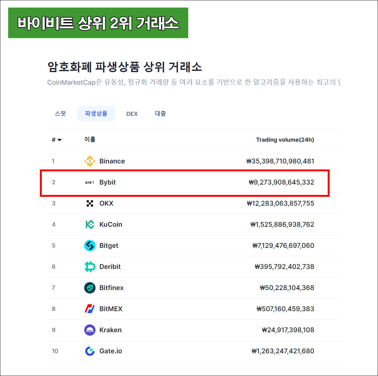 수수료 부담이 적은 곳으로 파생상품 부분에서 전 세계 2위를 유지하고 있다. 바이비트는 메이저 대형 거래소로 많은 거래량을 인증하며 안정적인 거래소임을 알 수 있다.