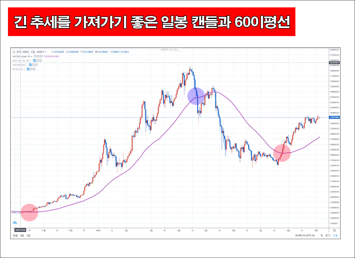60일 이동평균선을 1일 캔들 차트에 대입하면 긴 추세를 가져가기 좋은 지표가 된다. 중장기 관점으로 긴 추세 전체를 보유하면 상당히 큰 수익을 가져다 줄 수 있는 매매법이 1일 봉 차트 매매법이다.