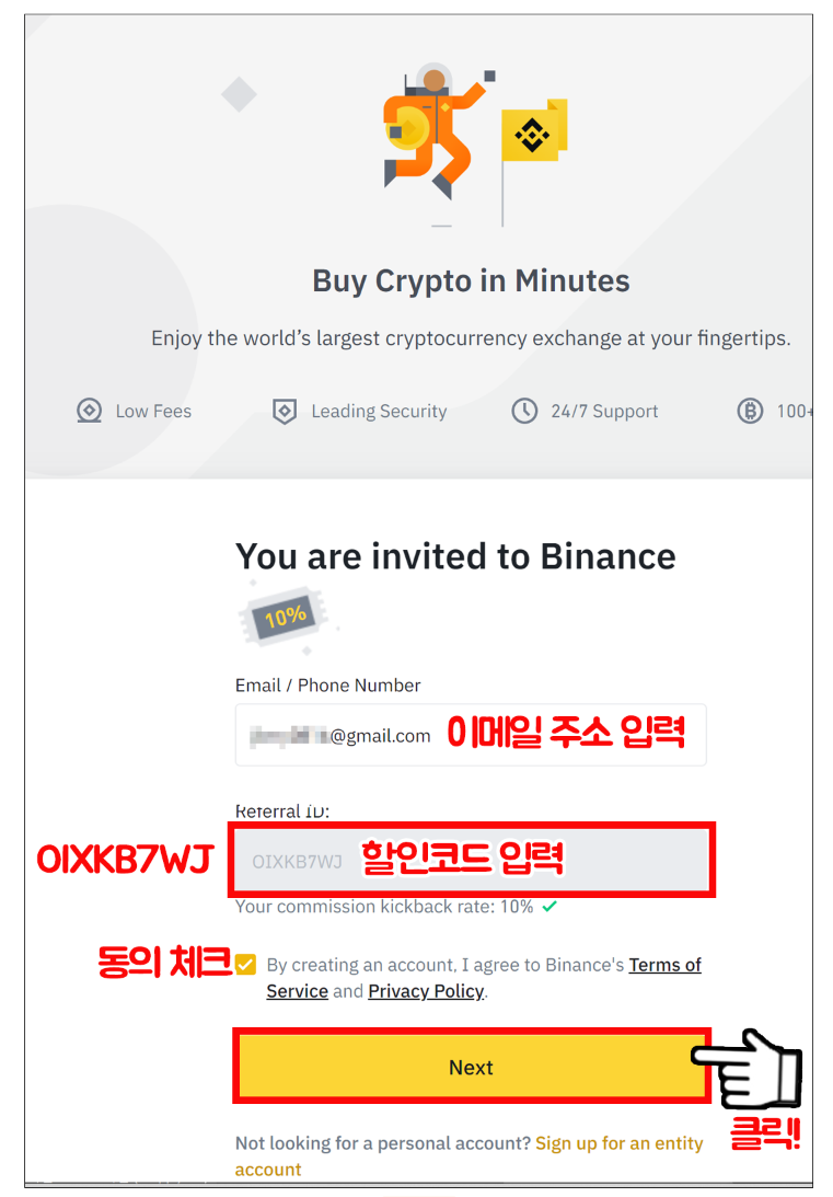 아이디 입력란 위에 10%할인 표시가 확인되면 추천인코드가 입력된 것이다. 이메일주소를 입력하고 아래의 레퍼럴 ID에 OIXKB7WJ가 자동으로 입력되어 있는지 확인하고 만약에 입력되지 않았다면 직접 코드를 입력해도 된다. 그리고 체크박스를 클릭 후 노란박스의 Next를 클릭한다.