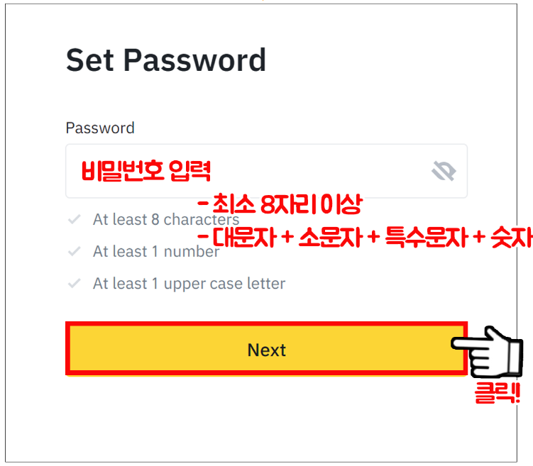 다음은 비밀번호 설정창이다. 비밀번호는 최소 8자리 이상으로 대문자 + 소문자 + 특수문자 + 숫자로 구성한다. 입력 후 Next를 클릭한다.