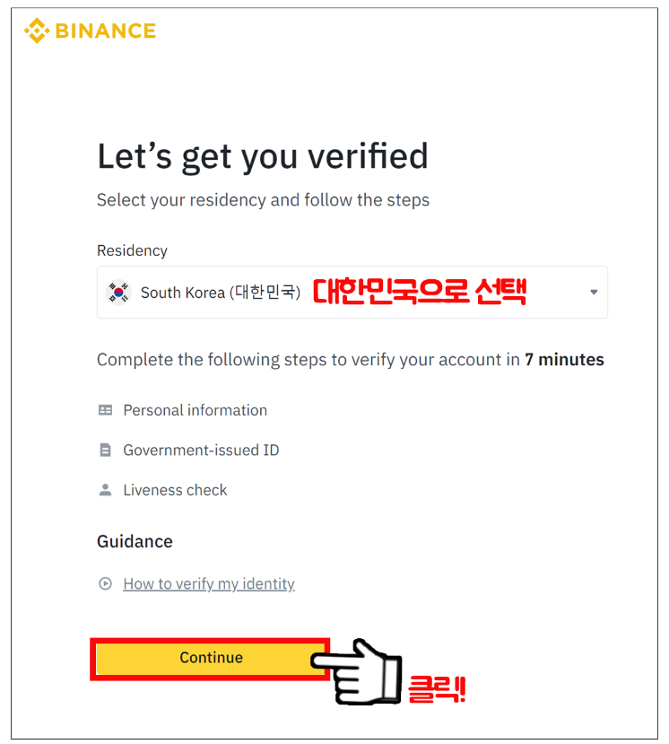 KYC인증은 필수이기 때문에 가입이 완료되면 자동으로 KYC인증 창이 나타나는데 국적은 대한민국으로 선택 후 Continue를 클릭한다.