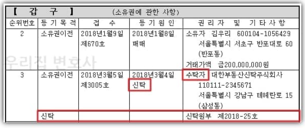 먼저 등기부등본의 갑구를 통해 신탁 여부를 확인해야한다. 갑구의 등기목적 항목을 확인하여 신탁여부를 체크하고 신탁 등기가 되어있는 경우에는 신탁회사의 동의를 받고 진행하거나 신탁회사와 직접 계약해야 한다.