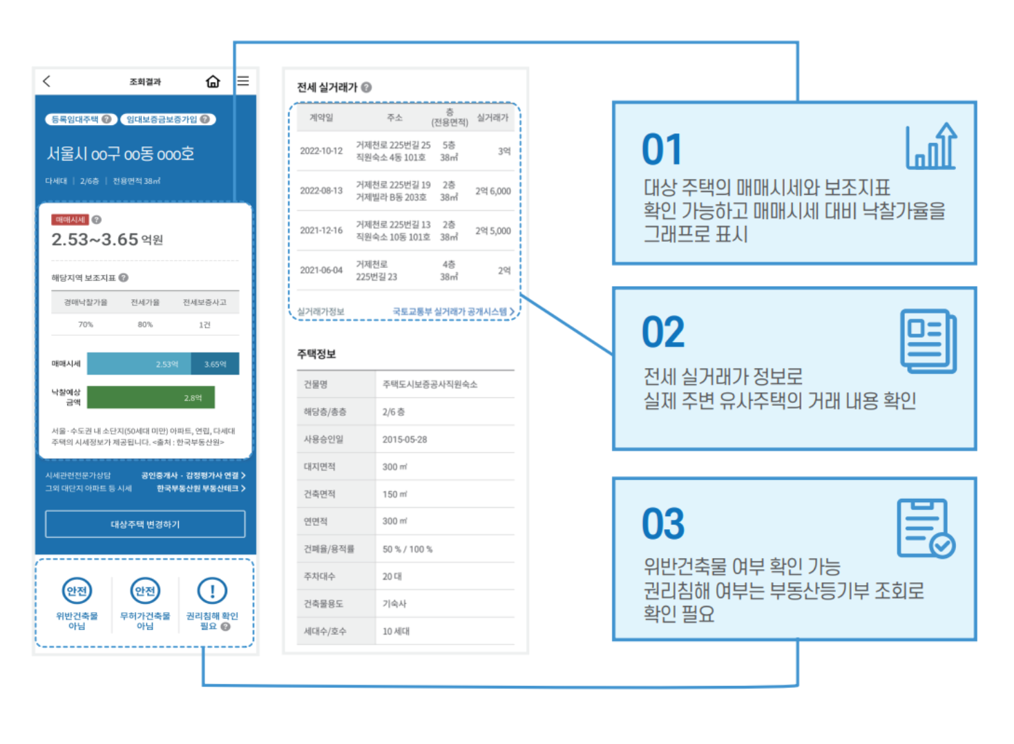 안심전세앱은 주변 유사주택 거래 내용이 확인가능하며 불법건출물 여부도 확인할 수 있다.