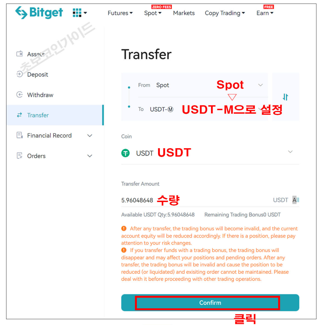 설정하고 코인은 [USDT] 아래에는 수량을 설정 후 최종 Confirm을 클릭한다.