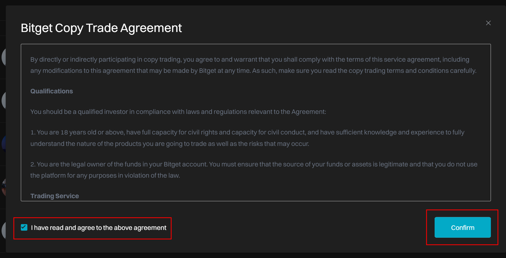 해당 트레이더의 성적을 확인하고 동의사항을 읽고 confirm를 누른다. 카피트레이딩은 여려명의 트레이더를 한번에 팔로우 할 수 있다.