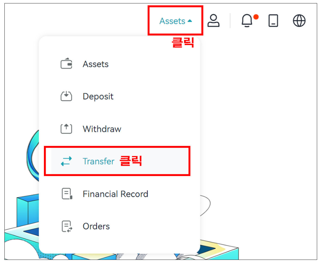 비트겟 거래소에 로그인 후 우측 상단의 [Assets]를 클릭 후 [Transfer]을 선택한다.