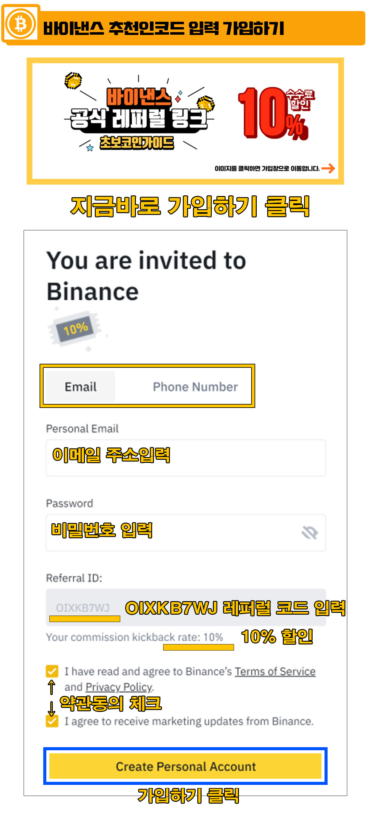 가입은 이메일 주소를 입력하고 아래에 비밀번호를 설정하고 Referral ID 칸에 공식 코드인 OIXKB7WJ 를 입력하여 수수료 최대 할인혜택을 적용받는다.
