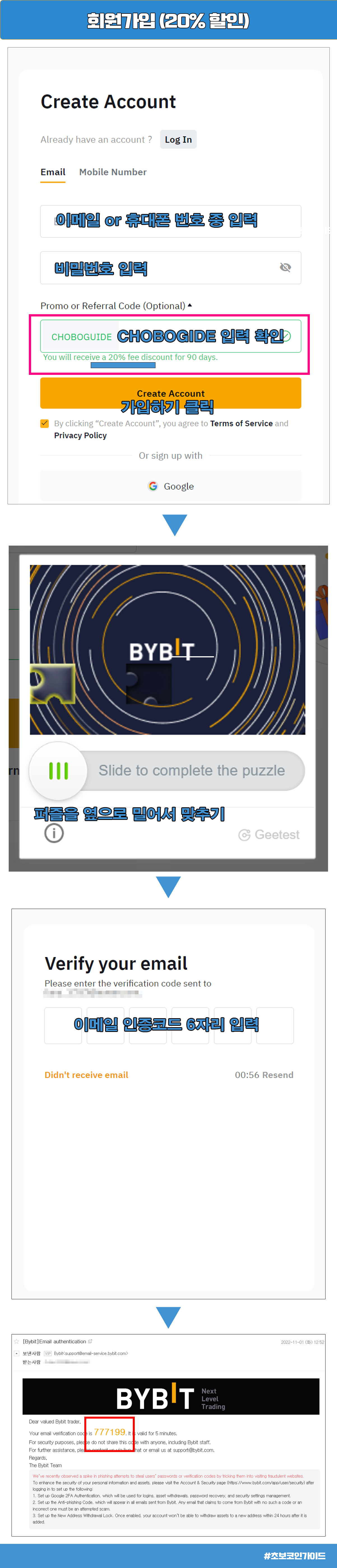 레퍼럴 코드칸에 CHOBOGIDE 입력된 것을 확인 후 동의사항에 체크 후 다음 버튼을 클릭 후 이메일로 온 인증코드 6자리를 입력하면 간단하게 가입이 완료된다.