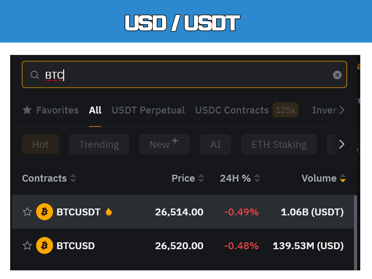 USDT는 테더(달러)로 코인에 투자를 하는 개념으로 이해하면 되고 USD는 코인으로 코인에 투자하는 개념이다.