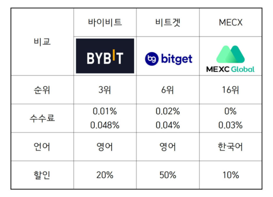 바이비트와 비트겟은 업비트 트래블룰 승인거래소로 입출금이 자유로우나 한국어 지원을 하지 않고 MEXC는 트래블룰 승인 통과 거래소가 아니라서 해외거래소를 우회하여 입출금을 해야하지만 한국어 지원이 가능하다는 점은 장점이다.