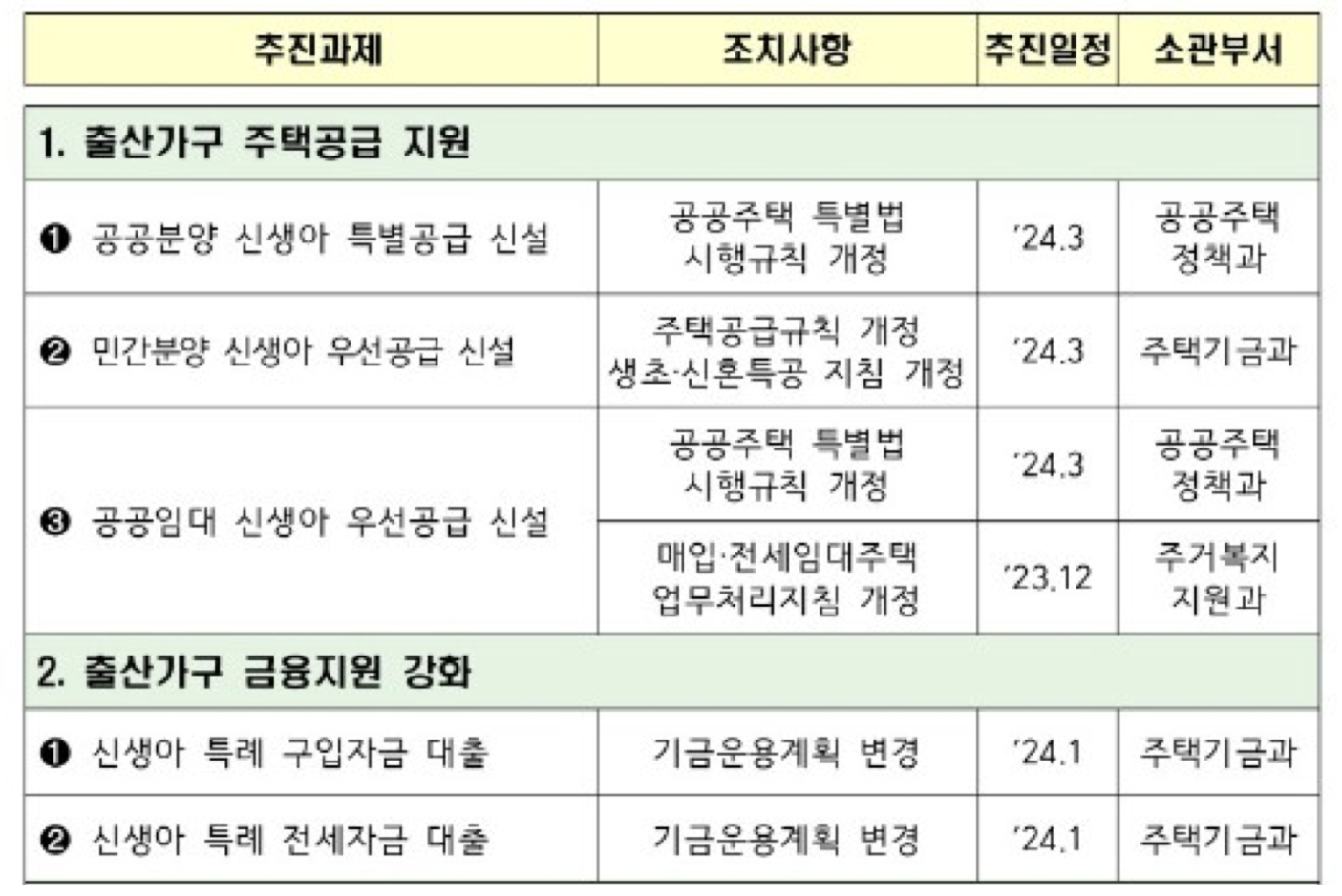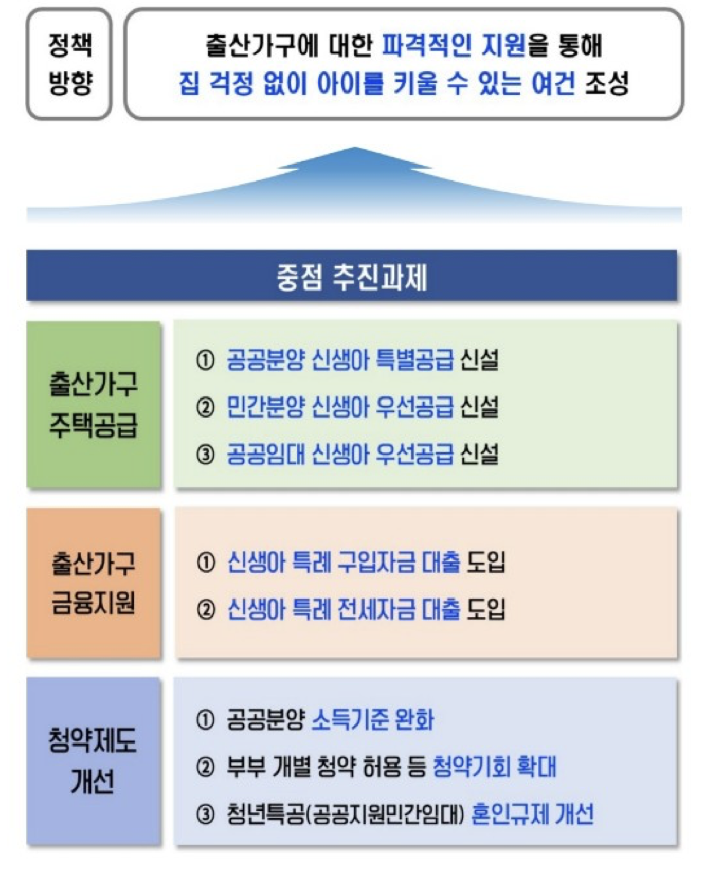 출산가구의 내집마련을 위해 저금리 구입자금 대출을 신설하고 소득요건은 2배로 상향했다.