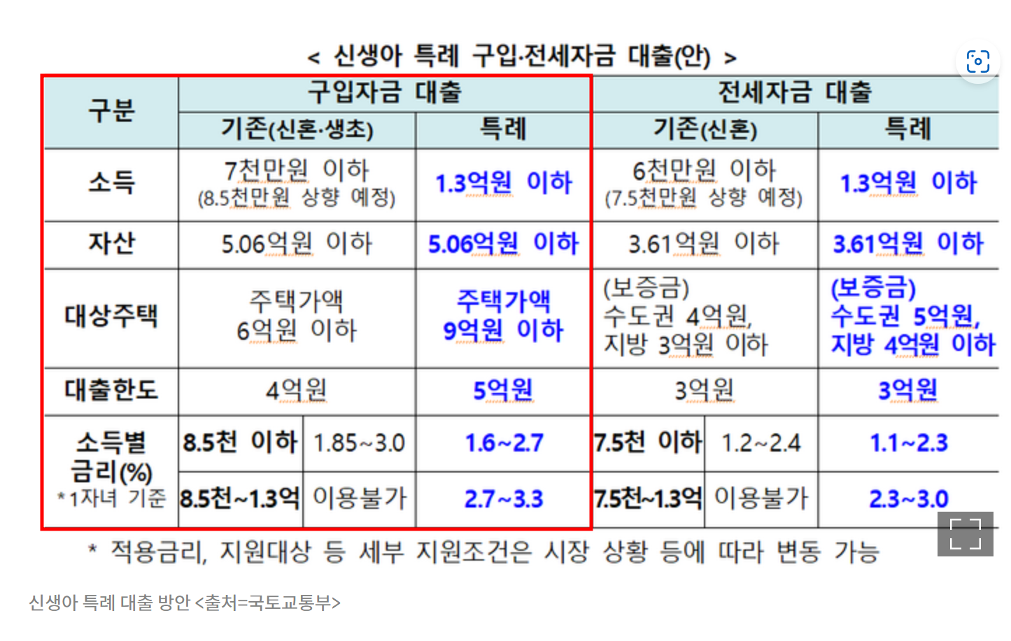 대출이 나오는 주택 기준과 한도도 완화하였으며 기존 신혼부부 대출은 6억원 이하 주택에만 최대 4억원 한도로만 가능했다. 신생아특례구입자금 대출은 9억원 이하의 주택까지 적용되었으며 대출한도도 5억원으로 높였다.