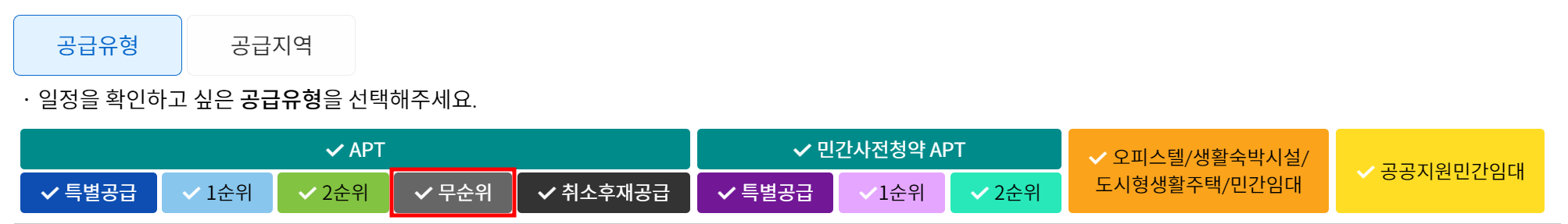 일반 청약처럼 한국부동산원 청약홈에서 진행하거나 해당 사업주체(조합 등), 건설사 홈페이지에서 신청할 수 있다. 무순위 이외에 계약취소 후 재공급건도 조회가 가능하며 검정바탕의 "취소 후 재공급"을 조회하면 된다.