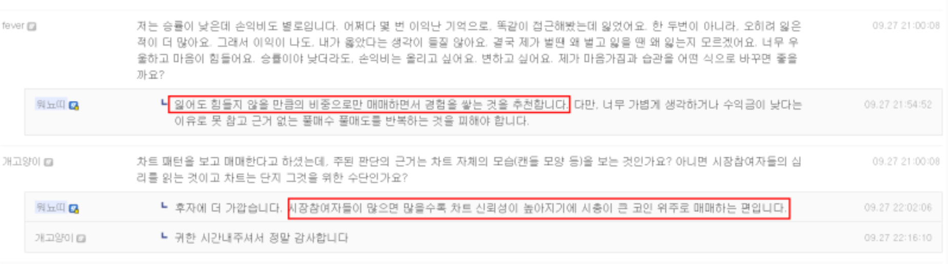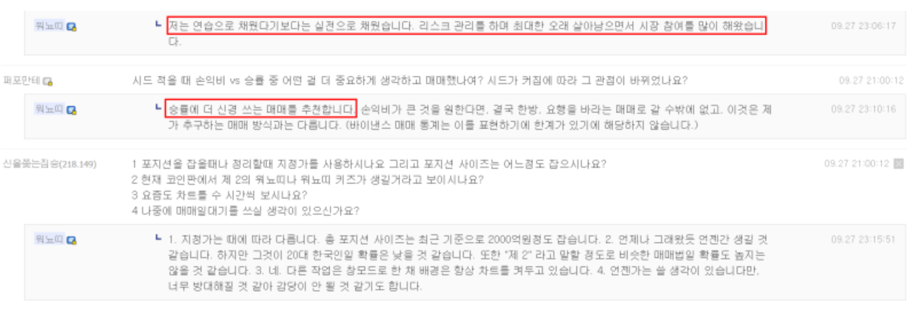 워뇨띠는 매매에 있어서 연습보다는 실전으로 실력을 쌓았다고 하며 리스크를 관리하면서 최대한 오래살아남고 시장 참여를 많이 하는 중요시 한다고 한다.