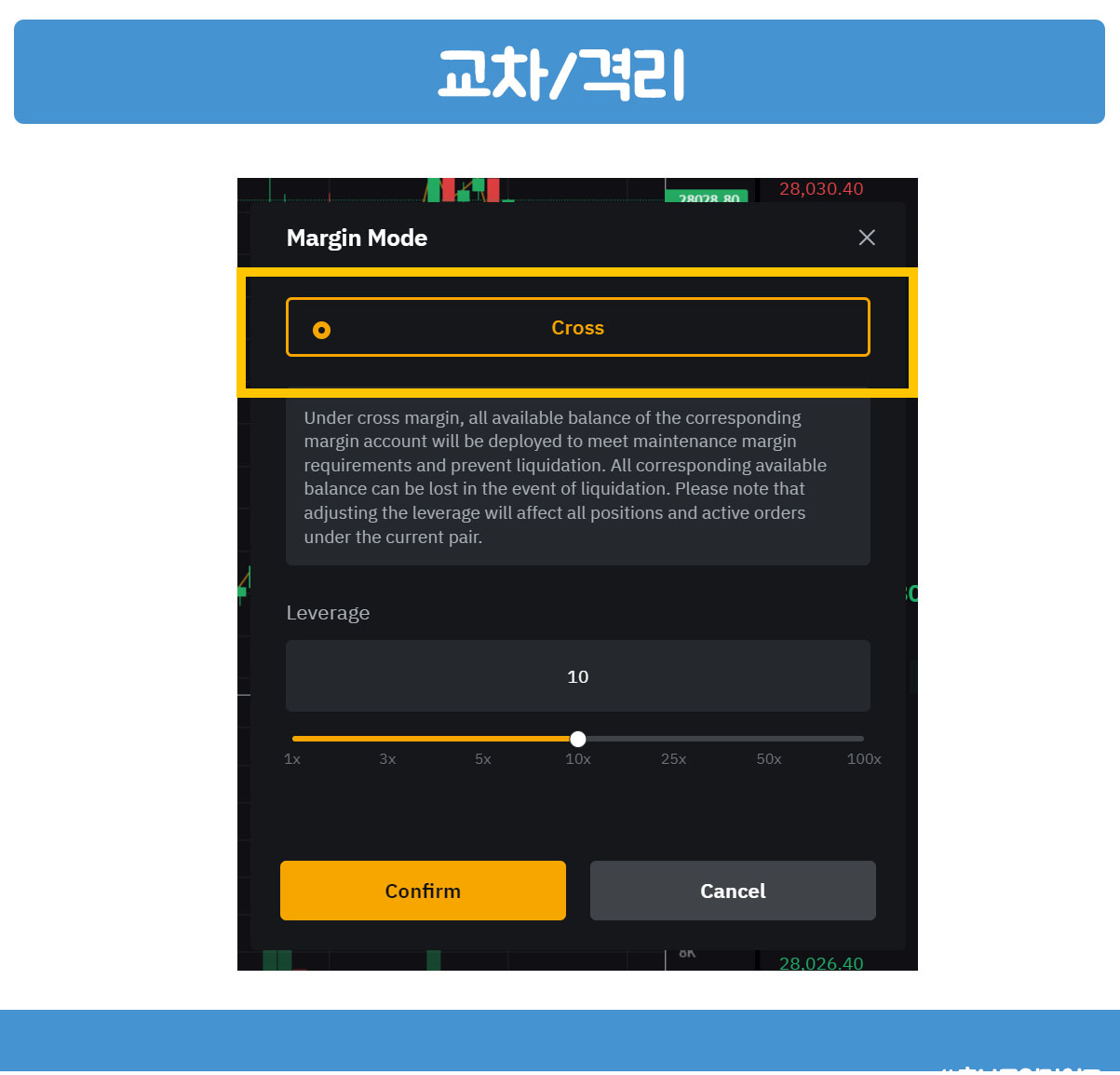- 교차 : Cross 선물지갑에 있는 모든 금액을 증거금으로 사용함