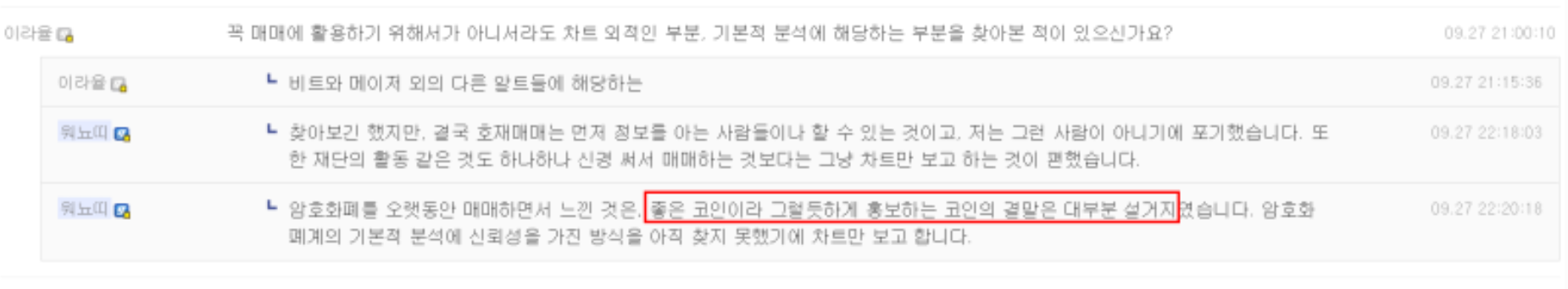 차트 외적인 부분을 보지 않는 이유는 호재매매는 먼저 정보를 아는 사람들이나 할 수 있는 것이고 재단 활동 하나하나 신경쓰기는 어렵기 때문이고 암호화폐를 오랫동안 매매하면서 느낀 거은 좋은 코인이라 그럴듯하게 홍보하는 코인의 결말은 대부분 설거지였다는 점이다.