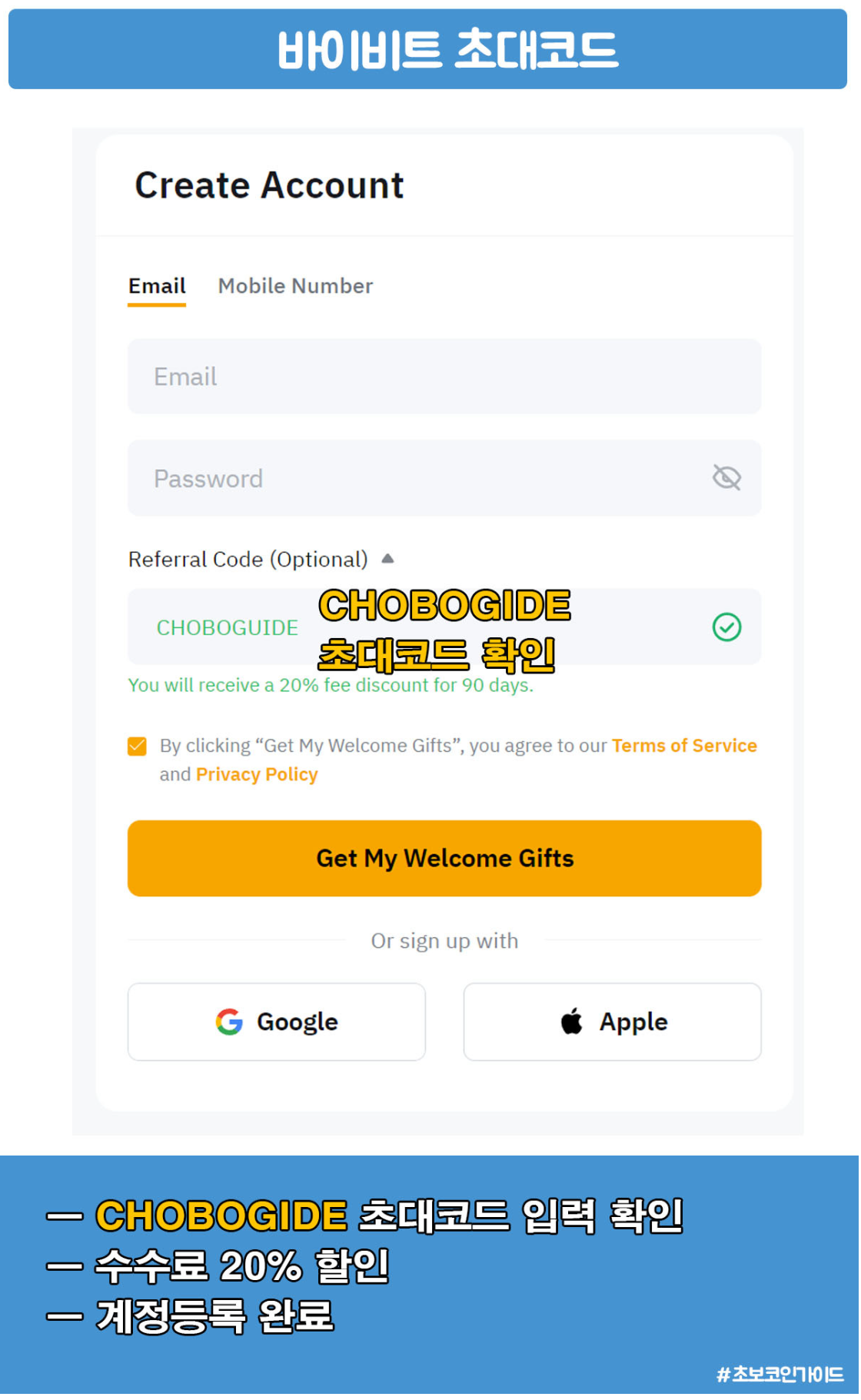 먼저 바이비트 거래소를 이용하려면 계정은 필수로 있어야한다. 아래의 초보코인가이드 공식 레퍼럴 링크를 통해 가입 시 수수료 할인과 신규가입 리워드 혜택을 받을 수 있다.