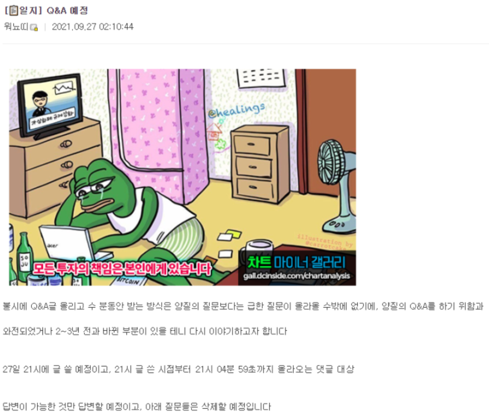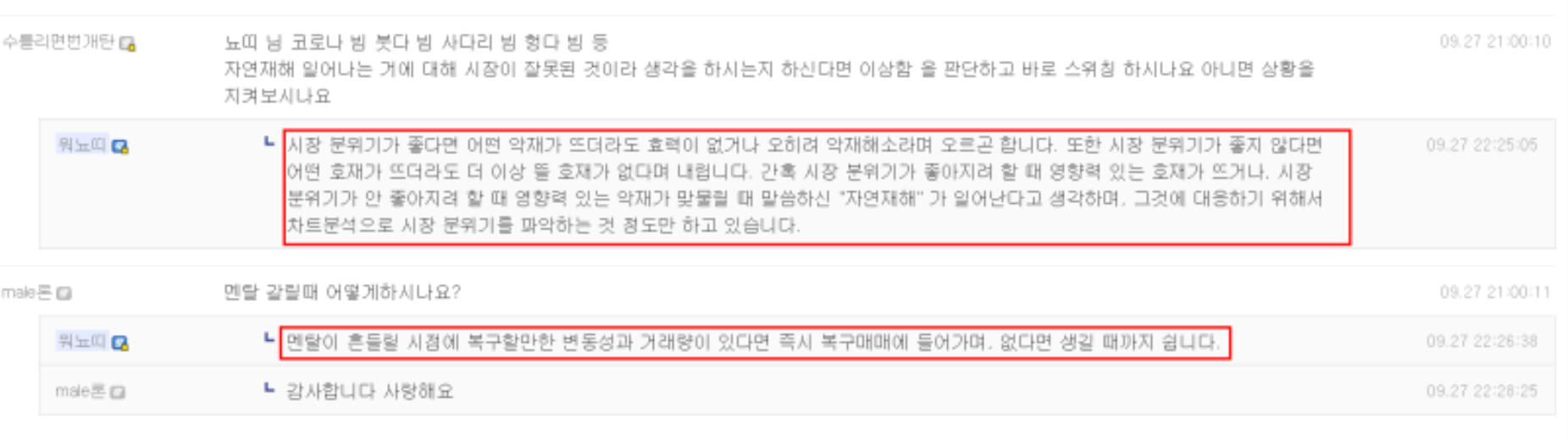 워뇨띠는 투자할 때 차트 외 부분을 10% 정도만 고려한다. 뉴스의 경우 시장 분위기가 좋다면 악재가 뜨더라도 효력이 없거나 악재해소라고 오르기 때문인데 반대로 시장 분위기가 좋지 않다면 어떤 호재가 뜨더라도 더 이상 뜰 호재가 없다고 내리곤 한다.