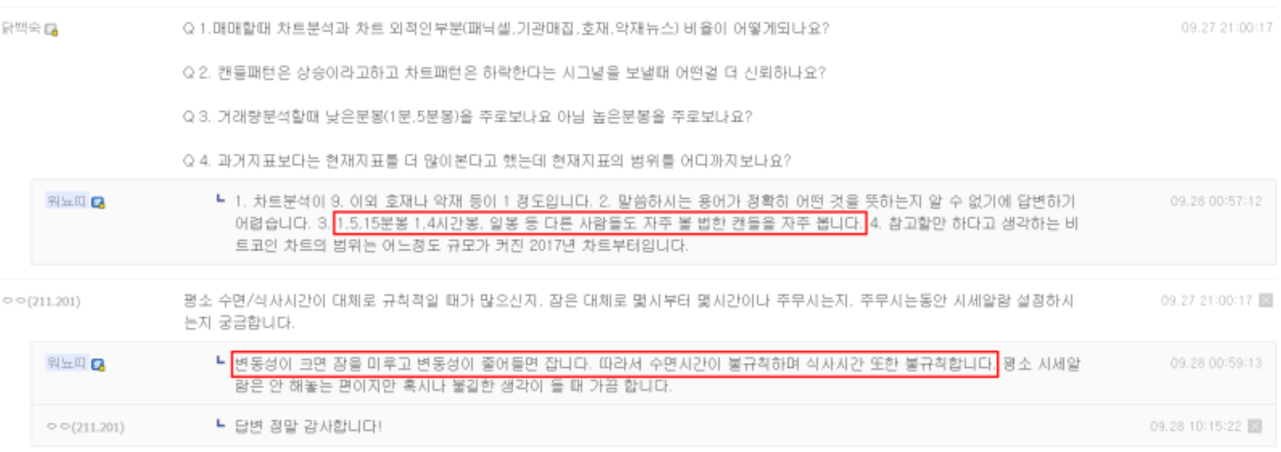 워뇨띠는 투자를 할 때 차트분석을 90%, 이외 악재 등의 뉴스는 10%로 정도만 참고한다고 했는데요 차트는 1, 5, 15분봉과 1, 4시간, 일봉 등 다른 사람들도 자주 볼법한 캔들을 본다고 한다,