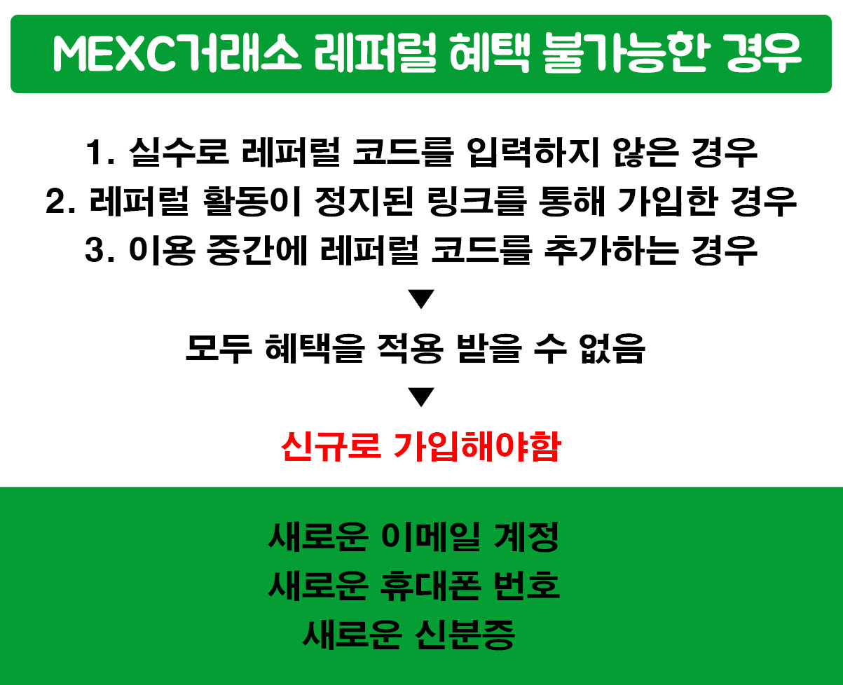 가입 시 레퍼럴 코드를 입력하는 것을 잊고 가입하거나 레퍼럴 활동이 정지된 링크를 통해 가입하는 경우 수수료 할인 혜택을 적용받을 수 없다. 또한 이용하고 있는 중간에 레퍼럴 코드를 추가 및 변경하는 것도 불가능하기 때문에 최초 가입 시 정상적인 레퍼럴 코드를 입력하지 않았다면 신규로 가입하는 방법 밖에 없다.