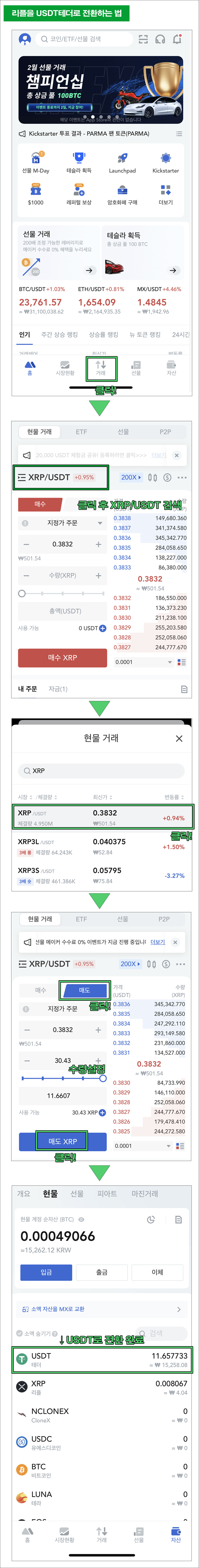 MEXC는 1:1 다이렉트 스왑기능을 제공하지 않는다. 직접 매도를 해야하며 예시는 리플로 진행하였다. 현물거래창으로 이동한 후 XRP/USDT를 검색하고 수량 설정 후 매도를 진행하면 USDT 테더코인을 얻을 수 있다.