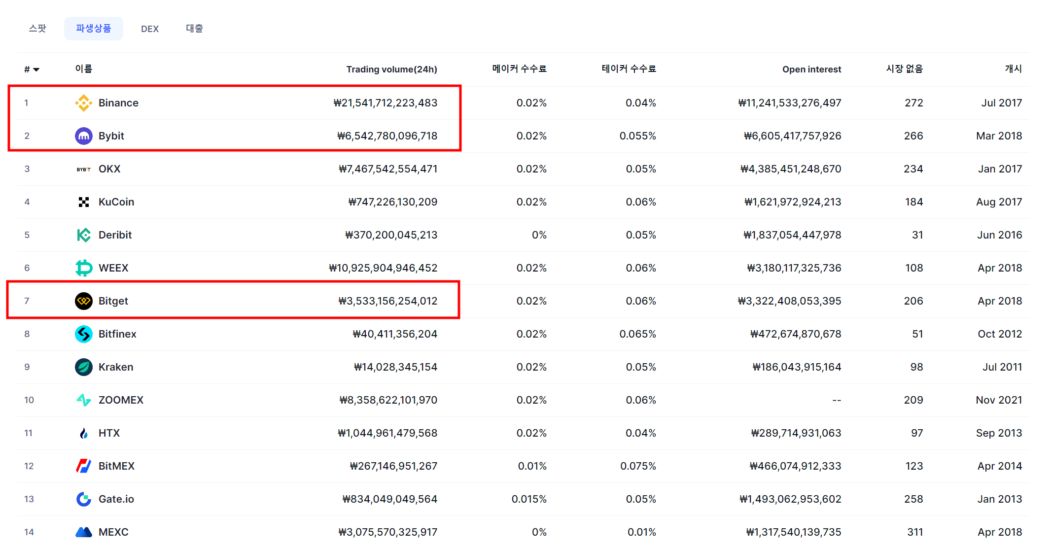 바이낸스는 1위, 바이비트는 2위, 비트겟은 7위로 추천하는 거래소 모두 상위 TOP 10에 들어가는 메이저 거래소로 풍부한 거래량과 다양한 코인을 보유했기 때문에 이용하기에 추천드린다.