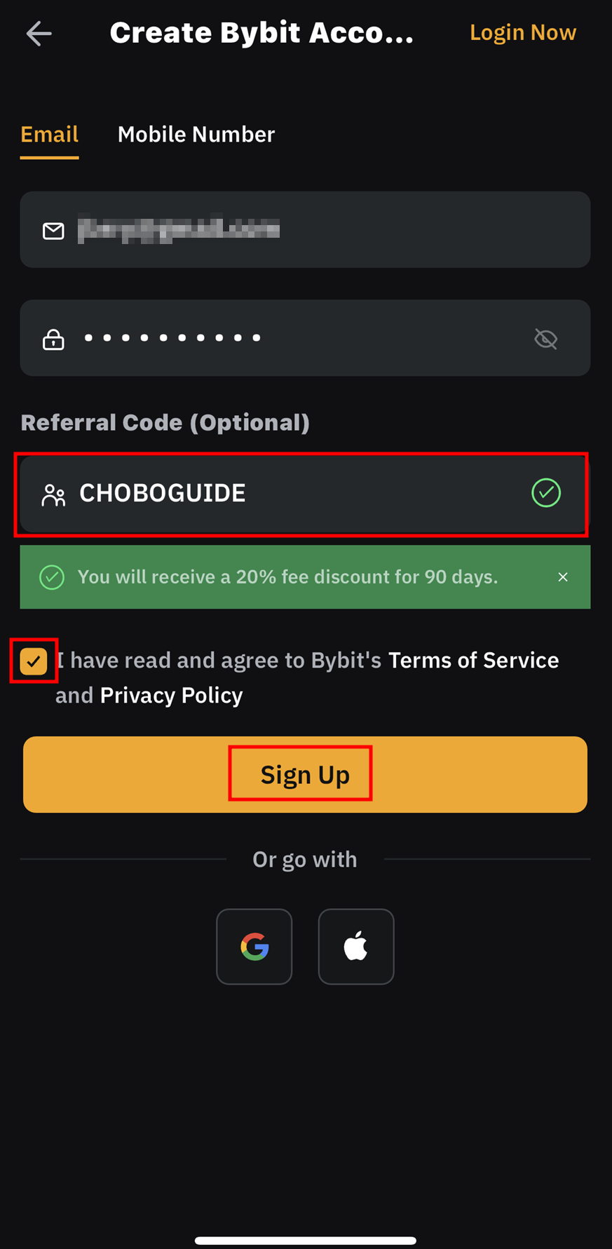 위 링크를 통해 가입하시거나 모바일에서 직접 가입 시 레퍼럴 코드란에 CHOBOGUIDE 를 직접 입력하셔도 됩니다.