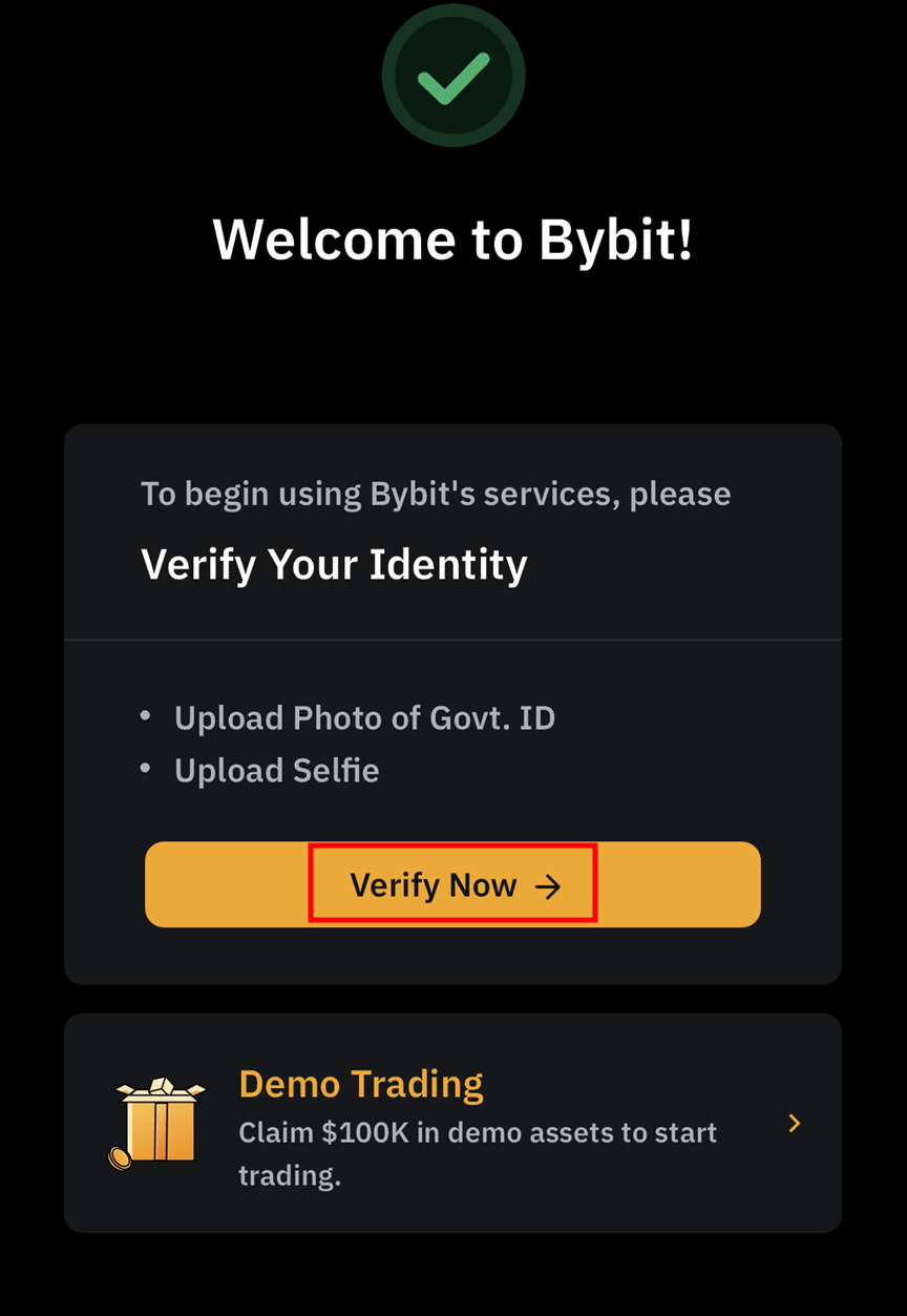 위 화면에서 노란박스 Verify Now를 클릭하거나 바이비트 홈 화면에서 좌측 상단의 사람 아이콘을 클릭한 다음 Identity Verificattion을 클릭한다.
