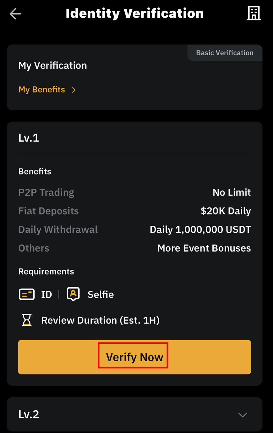 승인이 완료되면 Identity Verification의 레벨이 Lv.1 Verified로 바뀌게 된다.