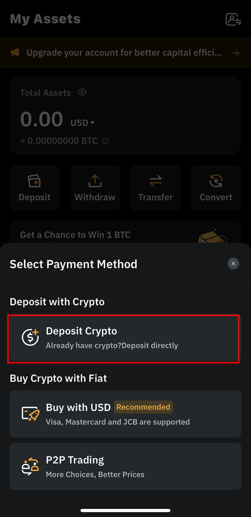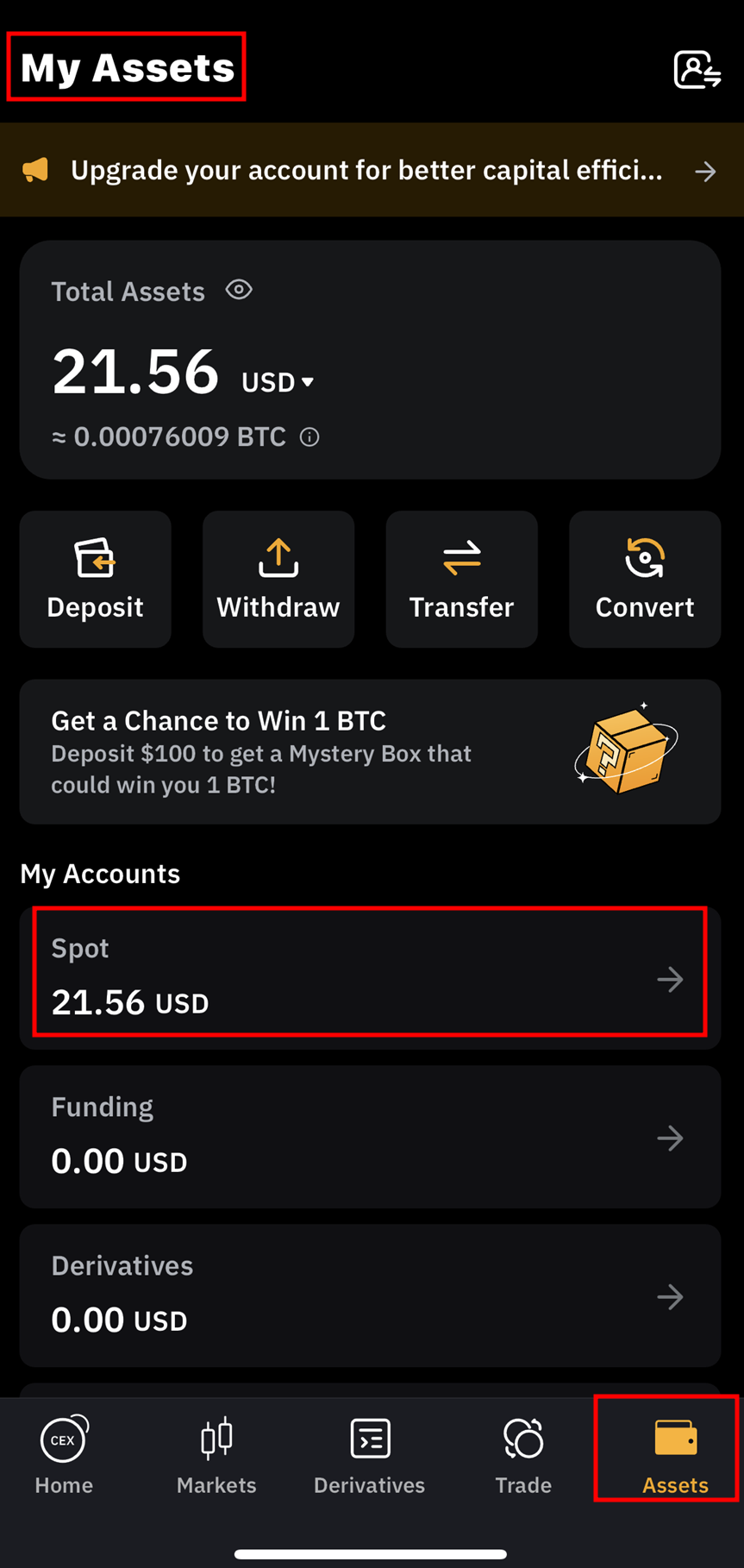 바이비트 앱 하단의 Assets에서 입금된 코인을 확인할 수 있다. 만약 코인이 정상적으로 입금되지 않았다면 입금 주소와 데스티네이션 태그를 바르게 입력했는지 확인해본다.