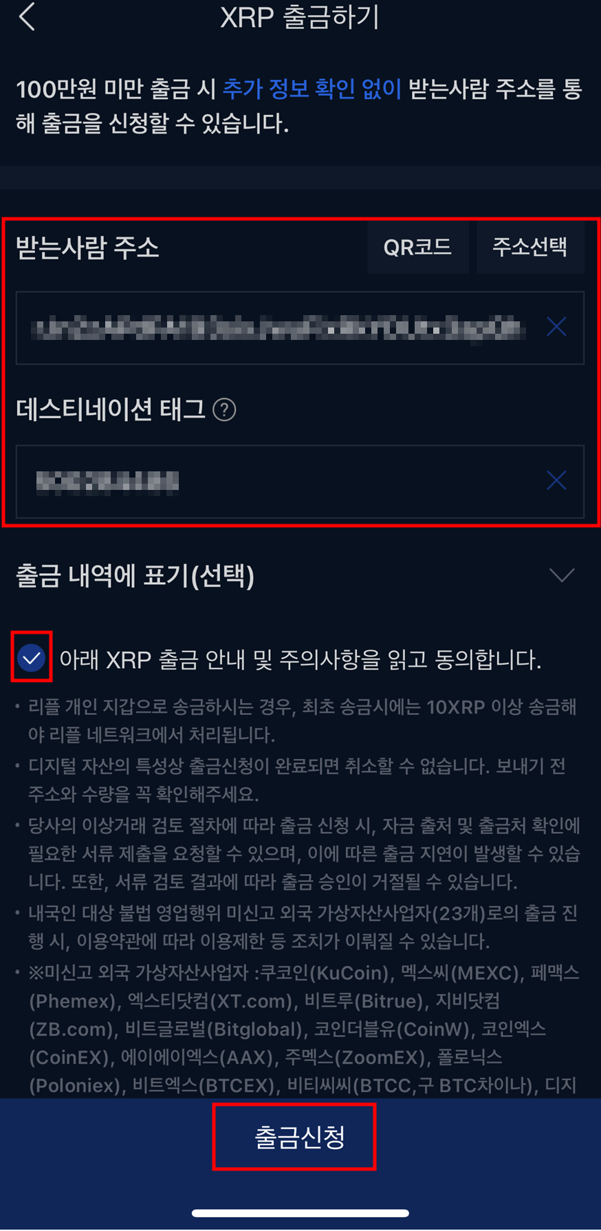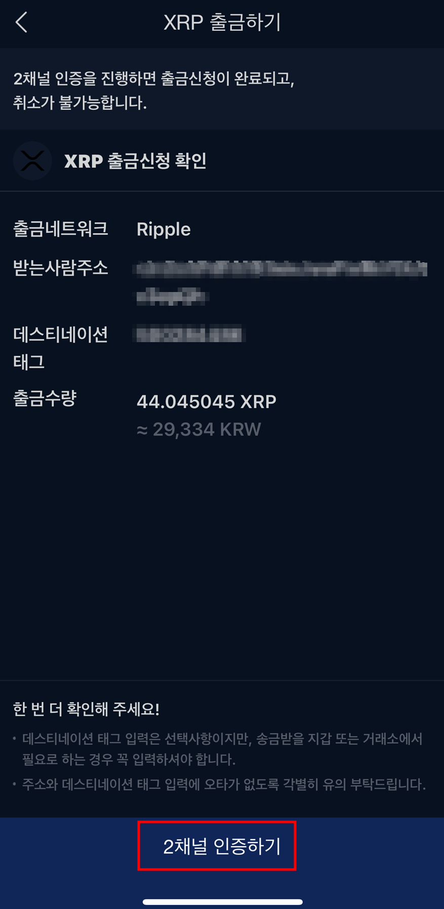 ※ 전송할 때 데스티네이션 태그를 누락하면 입금이 제대로 되지 않을 수 있기 때문에 꼭 주의해야한다.