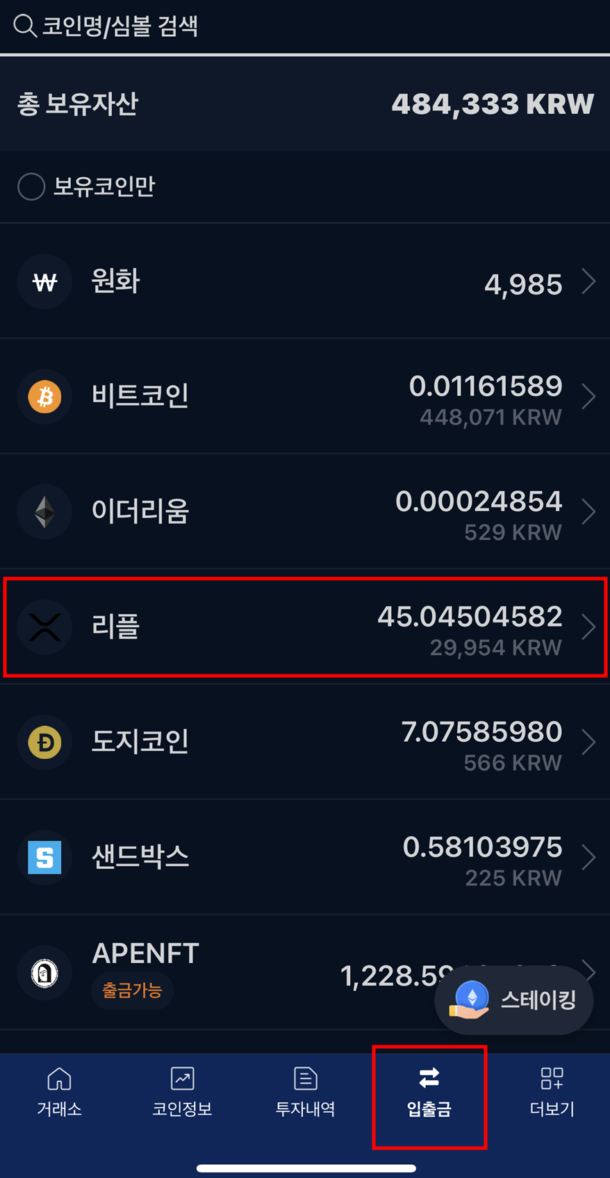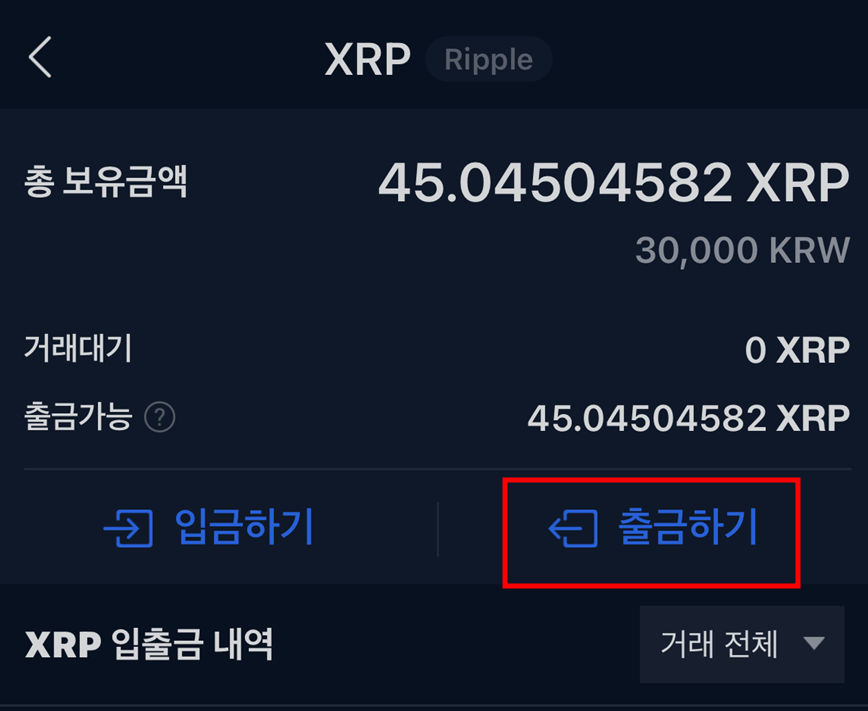 리플을 구매후 하단 입출금 탭의 보유코인 목록에서 리플을 클릭하고 출금하기 버튼을 선택한다.