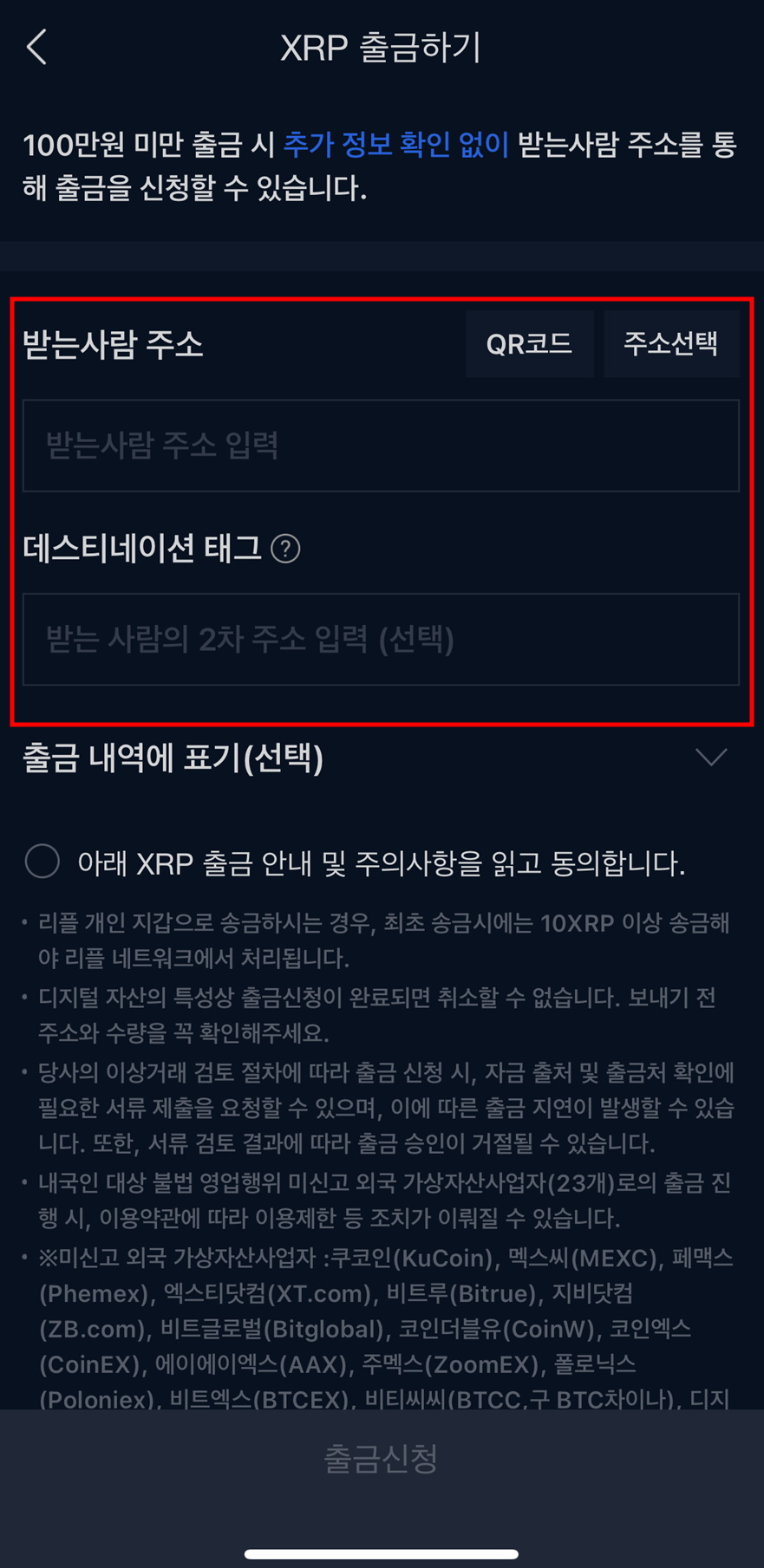 업비트앱으로 다시 이동하여 받는사람주소에 - 주소, 데스티네이션 태그 - 데스티네이션태그를 각각 붙여넣기한다.
