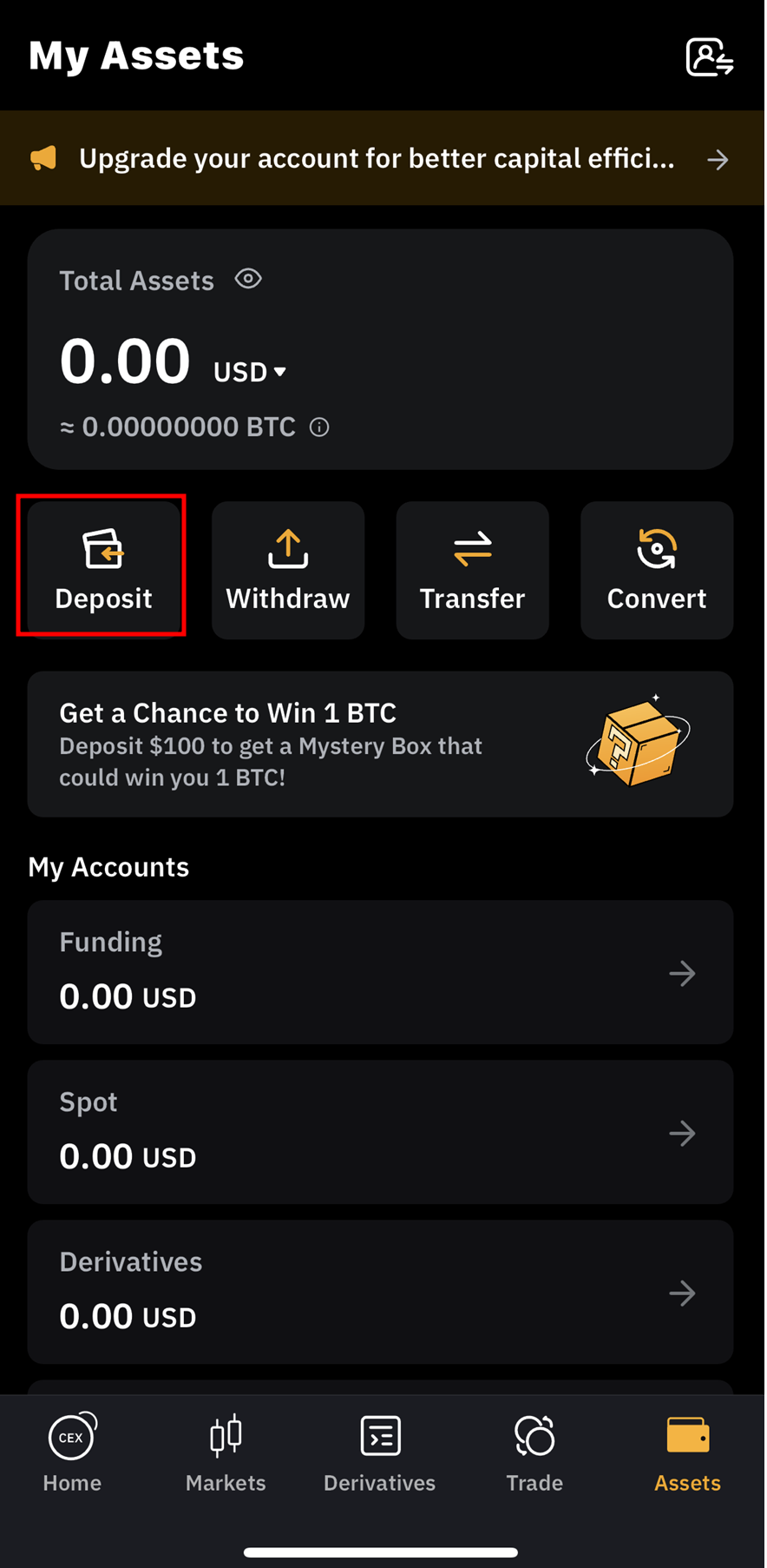 바이비트에 로그인 후 우측 하단의 Assets를 클릭한 후 다음 화면에서 Deposit를 클릭한다.