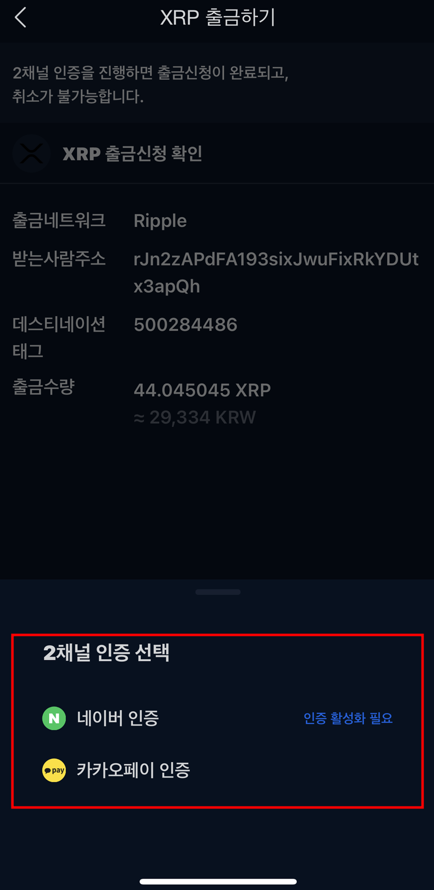 마지막으로 출금하기 창에서 2채널 인증하기를 클릭하고 네이버인증 또는 카카오페이 인증 진행까지 완료하면 인증이 완료되고 출금진행중인 것을 확인할 수 있다.