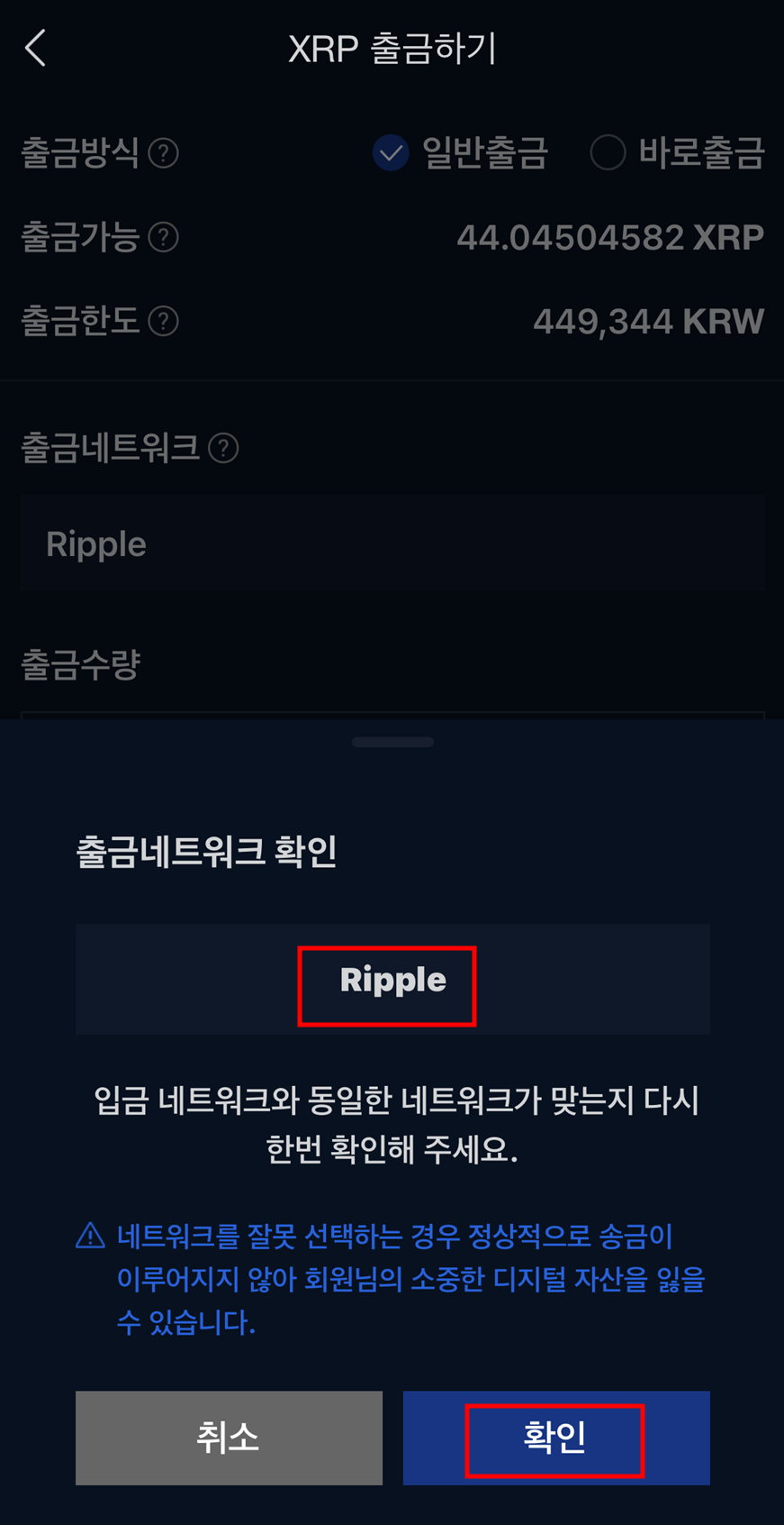 출금네트워크에 전송할 코인 Ripple이 적혀있는지 확인하고 출금수량을 선택한 후 확인을 누른다.