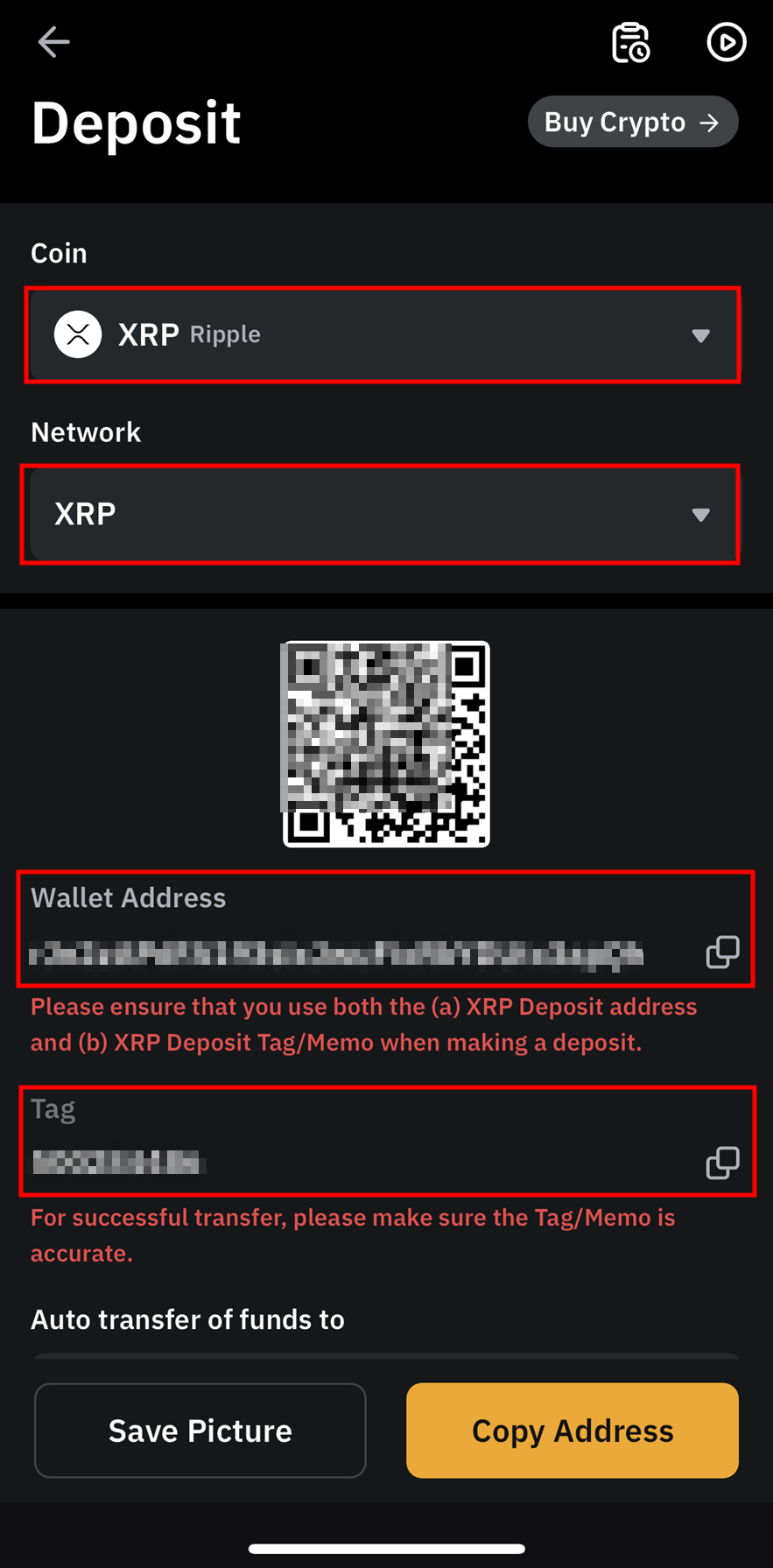 QR코드와 함께 코인주소와 데스티네이션 태그가 생성된다. 각각의 코인주소와 데스티네이션 태그를 복사한 다음