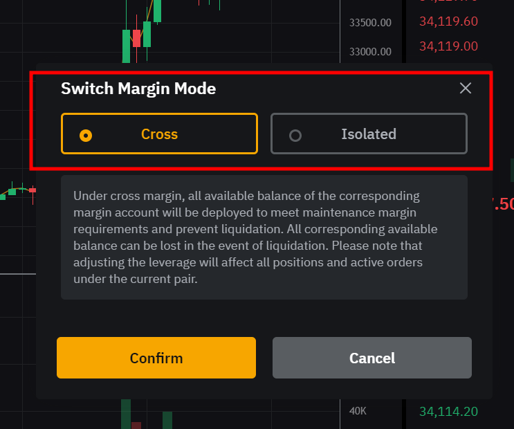 • Cross 교차 : 본인이 가지고 있는 USDT 전부를 증거금으로 잡는 것으로 청산가가 멀다는 장점이 있지만 청산을 당하게 되면 가지고 잇는 모든 자본금을 청산 당할 수 있다는 위험성이 있음