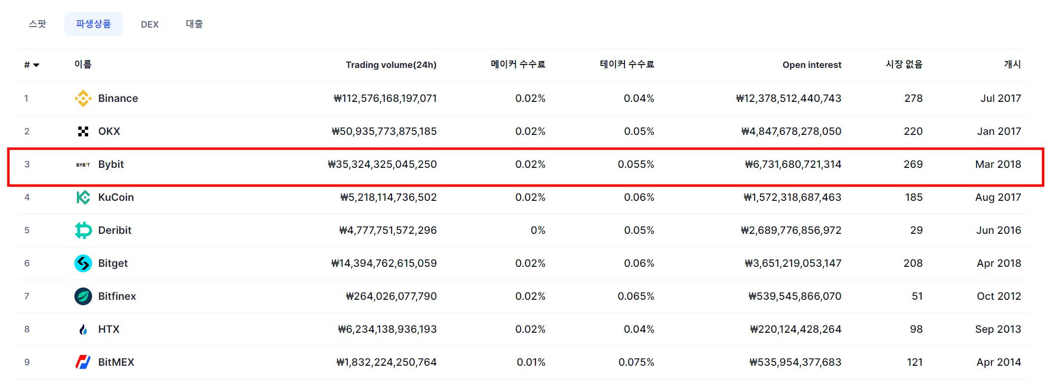 바이비트는 세계 10대 거래소로 현재 파생상품 3위 거래소로 풍부한 거래량과 다양한 플랫폼을 제공하고 있다. 직관적인 UI로 사용자가 사용하기 편리하며 트래블룰 승인 거래소로 입/출금도 자유롭기 때문에 국내에도 거래자가 많은 인기 거래소 중 하나이다.