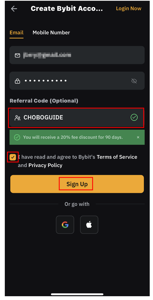아이디는 이메일주소 또는 휴대폰 번호 중 본인 명의로 입력하고 비밀번호는 대문자 + 소문자 + 특수문자 + 숫자를 조합하여 입력하고 레퍼럴 코드창에 CHOBOGUIDE가 입력되어있는지 확인 후 동의사항 체크 후 최종 Sign Up을 클릭하면 된다.