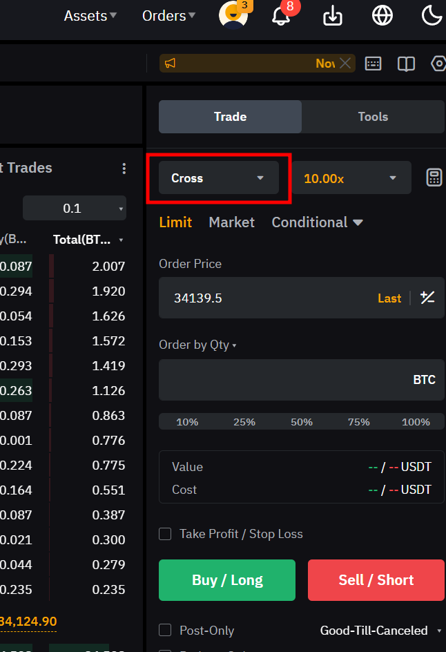 • Isolated 격리 : 본인이 희망하는 만큼만 USDT를 진입하고 증거금으로 잡아서 거래를 하는 방식으로 청산가가 교차에 비하면 가깝지만 청산을 당하더라라도 본인이 진입한 금액만 청산당하게 됨.