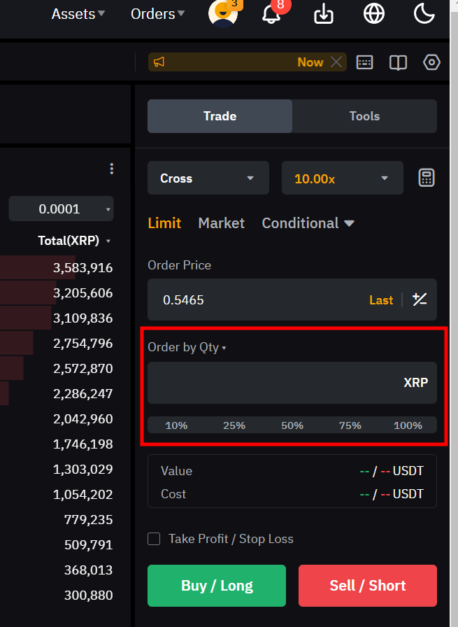 그 다음 수량을 설정하면 되고 아래의 TP/SL를 설정하면 손익절을 설정할 수 있다.