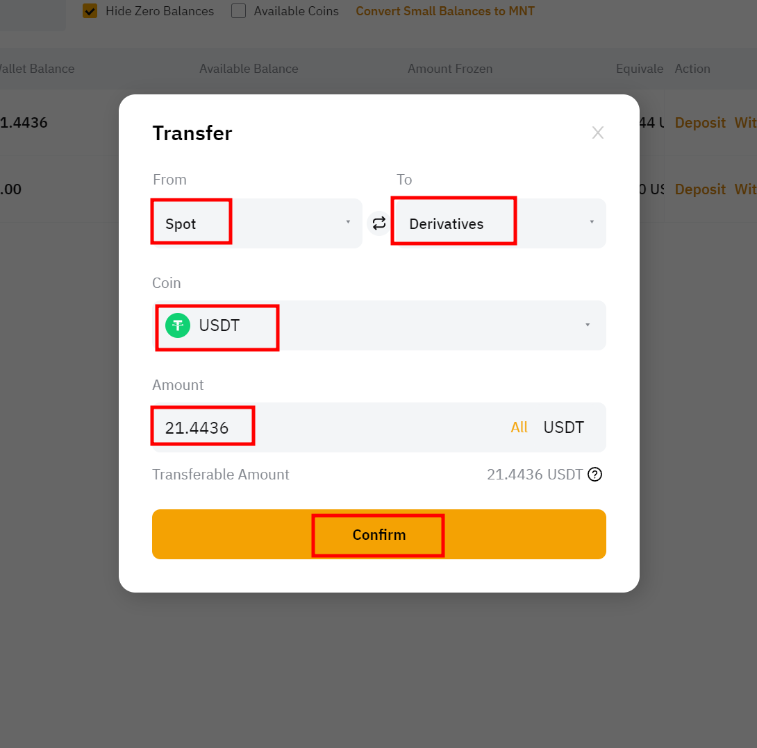 Amount (수량) 설정 후 최종 Confirm을 클릭하면 현물 지갑에서 선물 지갑으로 자산이 옮겨진다.