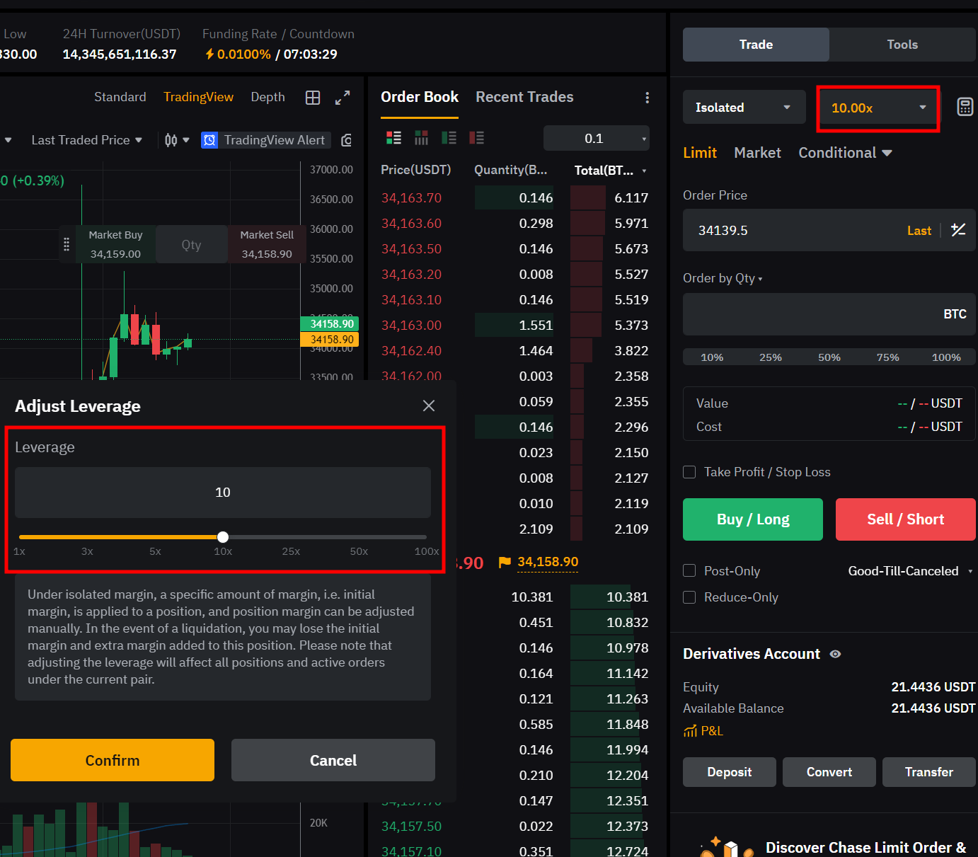 레버리지는 교차와 격리 중 선택을 완료한 후에 본인이 가지고 있는 금액 보다 많은 금액으로 거래에 진입할 수 있으며 레버리지를 설정한 만큼 배로 돈을 벌거나 잃을 수 있다.
